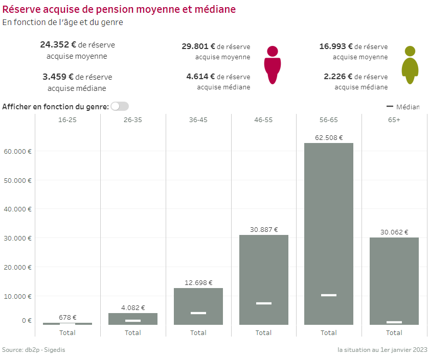 Pour l’ensemble des 4,29 millions de personnes avec des droits de pension complémentaire, la réserve acquise moyenne est de 24.352 euros. La réserve médiane, c’est-à-dire la réserve acquise par l’affilié le plus moyen, est beaucoup plus basse : 3.459 euros.